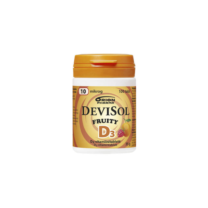DeviSol Fruity on hedelmäinen, persikan ja vadelman makuinen D3-vitamiinitabletti. Purutabletti hajoaa helposti suussa ja se on makeutettu ksylitolilla ja sorbitolilla.