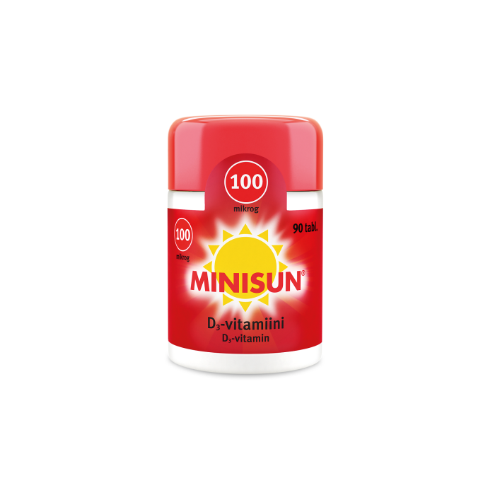 Minisun D-vitamiini 100 mikrog on vahva D-vitamiinivalmiste , joka sopii käytettäväksi päivittäin tai kuureina, erityisesti kun kehon D-vitamiinitaso on alhainen. Hyvänmakuiset purutabletit sisältävät tehokkaasti imeytyvää D3-vitamiinia. Minisun 100 mikrogrammaa sopii D-vitamiinin saannin tehostamiseen aikuisilla ja ikääntyvillä. Ksylitolilla makeutetut tabletit voi imeskellä, pureskella, niellä tai murskata. Laktoositon, gluteeniton, hiivaton, soijaton ja liivatteeton.